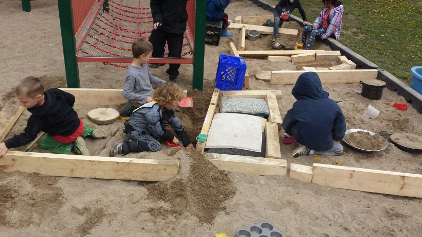 At school, we have asked students to save play fighting and wrestling as home activities. We are constantly evaluating the benefits vs. risks of activities and feel that the supervision of parents might be better in these particular situations. One way we encourage children to experience ‘big body’ play is through the use of large, heavy materials. Our students carry and use heavy wooden planks and tree discs during outdoor learning. In the picture below, they created a whole house using the wooden planks as the walls. Students use large pots to carry sand and water. We facilitate whole group games of tag, manhunt and hide and go seek. Our outdoor time is active, creative and most importantly, fun!