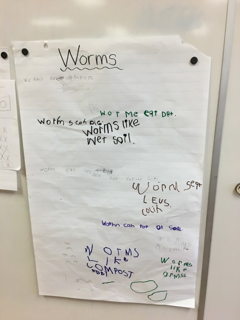 In the picture below, a group of students had listened to a podcast on worms. They used one piece of chart paper to record what they learned in a shared writing approach. Using skills that were taught in a small group, students had an authentic reason to practice writing because they were so excited to share what they had learned together.